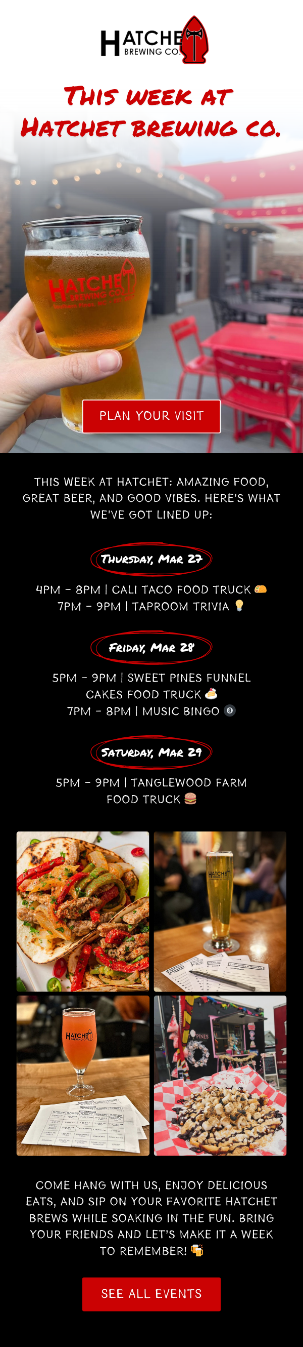 Send Email Campaigns More Consistently: They were not consistently sending out emails on a weekly basis. When we came on board, we ran a strict schedule of sending a campaign every Wednesday (before all the weekend events kicked off) to let their audience know what was happening in the taproom that weekend.